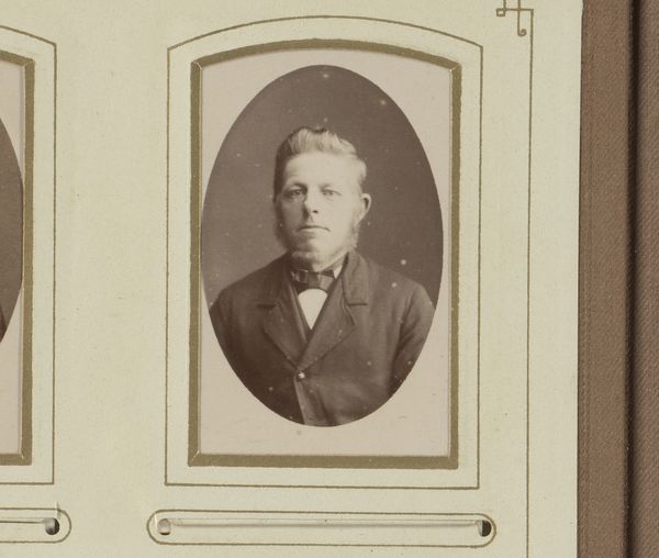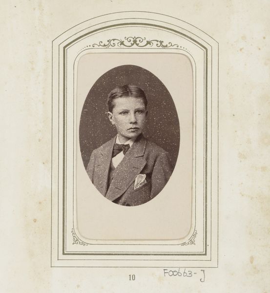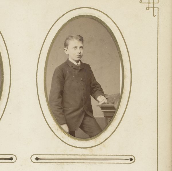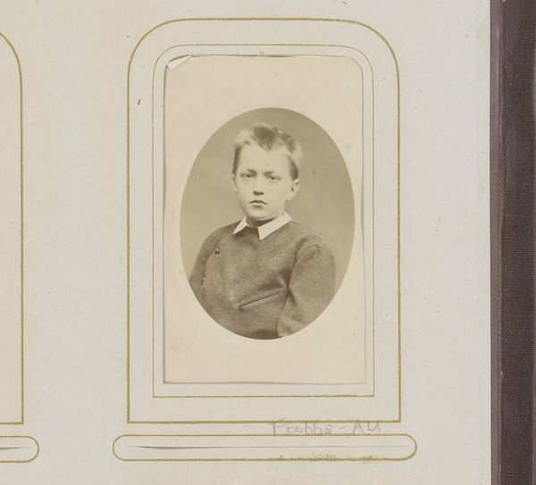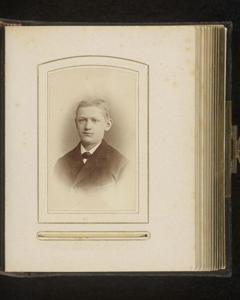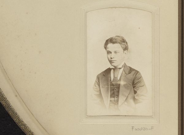 Curator: Here we have a captivating gelatin-silver print dating from between 1874 and 1900. It’s titled “Portret van een jongen” which translates simply to “Portrait of a Boy”. The artist, Cornelis Bernardus Broersma, really captured the likeness of this young subject. Editor: He has such a wistful expression! I can almost feel the weight of the era, of stuffy parlors and endless expectations pressing down on those young shoulders. And the monochrome, it makes everything feel somehow… removed. Curator: The monochromatic effect, so common with early photographic processes like gelatin-silver printing, arose from its specific chemical make-up and development practices, which certainly influences our reading of the subject's class and societal status through dress codes and popular consumption of these types of commodities. The development process itself, and the materials used, are as vital to its essence as the pose of the boy himself. Editor: Absolutely, you can see it almost feels mass-produced and intimate all at once—that stark juxtaposition that speaks volumes. All those tiny specks of silver forming an image; magic, almost! But restricted. Curator: Yes, it's fascinating how this photographic realism simultaneously aimed for objectivity, while the material choices – from the type of paper to the chemicals used in development - inherently shaped the final representation. Think about the labour involved, too – the photographer, the technicians preparing the plates. Editor: And don't forget the boy's labour! He’s acting out a role too, you know? Stiff, proper, "respectable". Makes you wonder what he’d have been like off-camera, throwing stones, perhaps. Curator: The context, I think, really makes one realize the way the camera captured images, dictated certain material relationships. It's not just about an aesthetic of realism. This work demonstrates both that process and a social code. Editor: Beautifully put! I suppose what resonates with me, beyond any intellectual understanding, is just how universal this child's face is, in the past, present, and the possible futures too. Curator: Indeed. Reflecting upon the image within its materiality provides deeper perspective regarding process and context. Editor: It makes you realize we're all still connected, by fleeting emotions preserved by ingenuity.