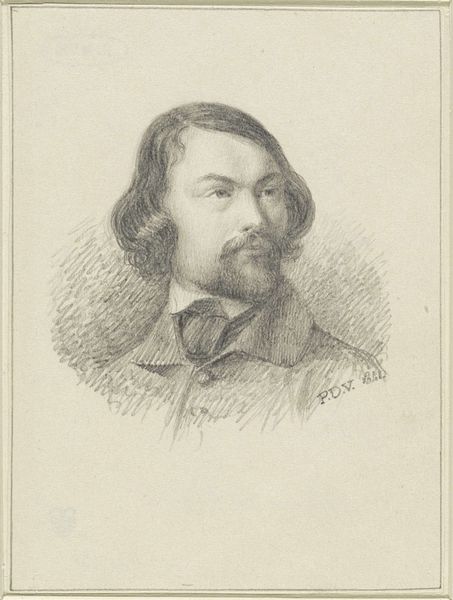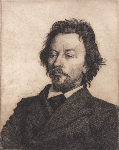 Peter Ilsted created this print, “Portret van Vilhelm Hammershoi,” employing delicate lines to capture the somber likeness of his contemporary. The composition, tightly cropped, focuses entirely on the figure, set against a muted background, heightening the sense of intimacy and introspection. Ilsted masterfully uses the etching technique to play with light and shadow. Look at how the subtle gradations of tone model Hammershoi's features, giving form to his face and clothing. Notice also the soft, almost blurred quality of the lines, which creates a sense of atmospheric depth and visual quietude. This portrait goes beyond mere representation. Ilsted seems to be exploring the very essence of Hammershoi’s artistic sensibility – his famous preoccupation with interiority, stillness and the profound beauty of the everyday. The print embodies a shared aesthetic vision, inviting us to look closely and find meaning in the understated.