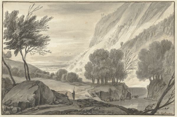 Curator: This engraving is titled "Landschap met rivier," or "Landscape with River," created sometime between 1739 and 1780. The artist is Francesco Bartolozzi. Editor: It has this calm, almost staged quality, like a scene from a pastoral play. The scale feels intimate, not grand, despite the rocky landscape. Curator: Bartolozzi used very precise line work, layering it to create depth and texture in the rocks, trees, and even the water's surface. It’s an excellent example of the graphic precision of the time. Editor: The presence of figures changes the work, doesn't it? Instead of merely depicting a landscape, it comments on leisure, and how this idyll is reserved for a select few who can afford to "find themselves" in nature. The romanticization of landscapes often obscures real labor behind them. Curator: Perhaps. But notice how the light plays across the figures, drawing the viewer's eye to their central position. It functions in a semiotic exchange to illustrate an attitude of harmony or equilibrium with the environment. I'd say the arrangement is classical in the sense that it aspires to ideals of balanced order. Editor: I am just thinking about those excluded from these tranquil vistas. How did land become a source of pleasure and escapism only accessible to a specific demographic? These landscapes weren't just there, untouched. Colonial extraction processes impacted environments represented, producing an artificial ideal that needs to be considered when analyzing these historical documents. Curator: You’ve given me much to consider. Thank you. Editor: Thank you for expanding my awareness on Bartolozzi's graphic expertise, bringing up points about composition I did not observe initially.