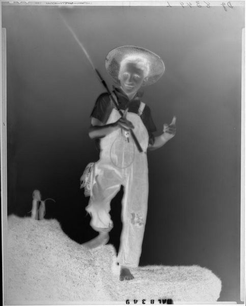 This silver gelatin print, "Untitled (two boys in fishing outfits with fishing pole posed on shag prop)," was created by Paul Gittings. The stark contrast immediately catches the eye, with the subjects almost glowing against a dark backdrop. The texture of the shag prop beneath their bare feet creates a tactile counterpoint to the smooth faces of the boys and their attire. The composition is rigidly structured, with the fishing pole acting as a strong vertical axis. Gittings presents us not with a candid snapshot, but a constructed image. He places his subjects on a stage, carefully arranging them for the camera. This sense of artifice invites us to question the relationship between photography and reality. Ultimately, it’s the deliberate and controlled use of light, texture, and form that speaks to the image's enduring presence. The photograph is a visual construction, inviting us to consider the staged nature of photographic representation.