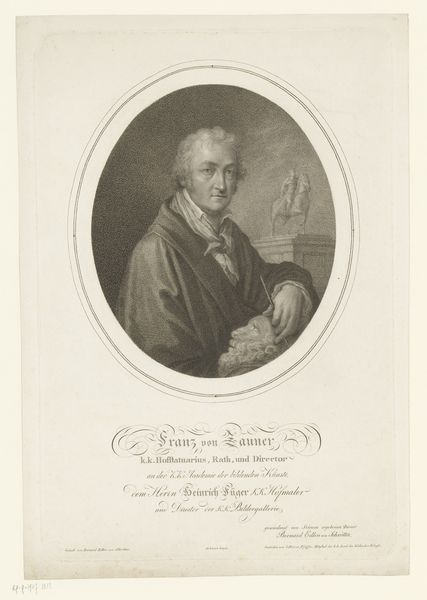 Francesco Bartolozzi created this stipple engraving portrait of Hendrik Karel Nicolaas van der Noot. The image is framed within an oval, a common stylistic choice that softens the formal rigidity typically associated with portraiture of this era. The monochromatic palette invites close examination of texture and form. The composition directs our gaze to the figure caught in a moment of reflection, quill in hand. Bartolozzi masterfully uses line and shadow to create depth, particularly evident in the drapery behind the figure. The books suggest not just literacy, but a world of intellectual engagement, which creates a certain tension between van der Noot as an individual and as a representative of enlightenment ideals. The very act of portraying van der Noot, an advocate for independence, challenges fixed notions of power. The print's formal qualities, its lines and textures, are not just aesthetic choices. They are components of a visual language that reflect broader cultural and philosophical currents and the changing landscape of European political thought.