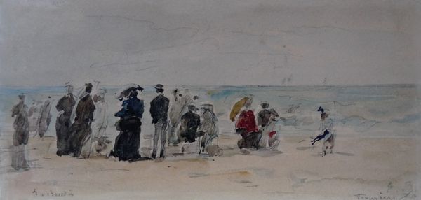 Berthe Morisot captured this scene of "The Banks of the Seine" with watercolor on paper. In it, we see figures along the riverbank, some sheltered under umbrellas, and boats gently gliding on the water. The umbrella, a recurring motif, transcends mere practicality. Its origins trace back to ancient civilizations, serving as symbols of status and protection. In ancient Egypt and Asia, parasols shielded nobles from the sun. This symbol evolved into the umbrellas we see today. Consider how the umbrella's symbolism subtly shifts across time. In Morisot's era, it signified bourgeois respectability, a delicate barrier against the elements for both men and women. However, across contexts, it becomes a tool for both hiding and revealing, an emotional shield. Morisot captures the interplay of concealment and exposure, reflecting a delicate balance between private emotions and public presentation. This seemingly simple object holds layers of meaning. This is a non-linear progression, reappearing, evolving, and taking on new meanings through different historical contexts.
