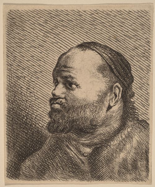 Curator: Here we have “Head of a Bald Man,” dating back to 1847. Peter Ludvig Meisling rendered it using graphite, woodcut, and engraving techniques. Editor: It’s incredibly somber. The lines are so deliberate, almost harsh, capturing a man lost in thought. Curator: The sitter’s downcast eyes immediately suggest a connection to a working-class or intellectual circles marked by periods of socio-economic disenfranchisement following the 1830s. Editor: The artist is using line work to achieve tonality so exquisitely. The stark contrast amplifies the somber mood, wouldn't you agree? Notice how the light glances off the planes of his forehead and nose, then dissipates to capture him. Curator: That contrast draws me into considering how conventional notions of masculinity and social mobility impacted portraiture and even opportunities for models, as the gaze of the sitter rejects the male gaze of its contemporaries. Editor: But think about how deliberately the artist rendered his beard. The contrast and textures, for instance, create such tangible visual tension against the flatness of the circular frame, offering dynamism within constraints. Curator: What I notice there is the use of visual language to signal or challenge evolving Danish identity within a rapidly shifting economic system and the impact that has had on working class and intellectual circles. Editor: You know, the formal treatment speaks to this quiet dignity. And it's the geometric planes within a circle, a stable shape, that suggests quiet resilience in the face of hardship. Curator: Ultimately, viewing Meisling’s print opens dialogues on class, identity, and the complexities of 19th-century Danish life. Editor: It is quite remarkable what analysis of light and shape reveals!
