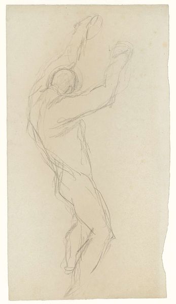 Curator: This is Abraham Walkowitz's sketch of Isadora Duncan, held at the Harvard Art Museums. I am struck by the dynamism evoked with just a few lines. Editor: It feels unfinished, almost a ghost of a figure. I wonder about Walkowitz's process here, and what this says about his, and our, perception of Duncan. Was this a study, or is it meant to stand alone? Curator: Duncan challenged societal norms around female expression. Her dance was about freeing the body. Walkowitz, also pushing boundaries in his own right, captures this sentiment. Editor: The sketch certainly emphasizes movement, and the lines suggest the draping of fabric; but the absence of detail also abstracts Duncan, perhaps even commodifies her image. Curator: Perhaps, but I see it as an homage to her spirit. The bareness speaks to Duncan's own embrace of simplicity and raw emotion in her art. Editor: Interesting. It certainly opens up avenues for considering the relationship between the artist, his subject, and the observer. Curator: Indeed, a powerful piece that invites further thought. Editor: A fitting end to our discussion. Thank you.