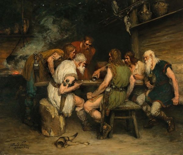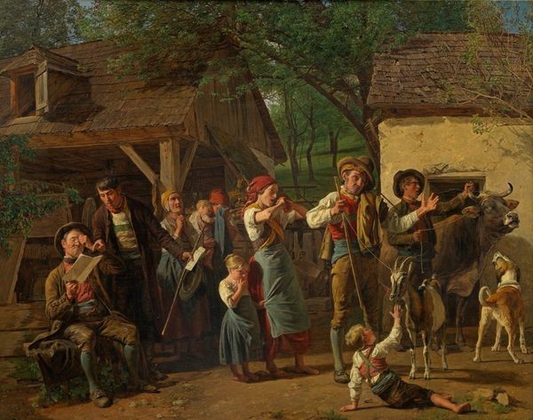 Editor: Thomas Uwins' "The Vintage in the Claret Vineyards of the South of France" showcases a lively scene. What stories do you think the symbols in this painting are telling? Curator: Consider how the grape harvest, a recurring motif, symbolizes abundance and celebration, and in religious contexts, transformation. The attire and tools also tell a tale about social roles. Editor: So, it's not just a depiction of labor; it's steeped in cultural meaning. Curator: Precisely! The artist taps into the rich vein of symbolic language embedded in everyday life, inviting viewers to decode a deeper narrative. Editor: I see the image now as more complex and layered. Curator: It's a reminder of how visual elements contribute to our understanding of the past.