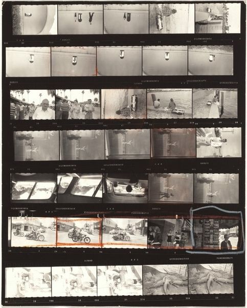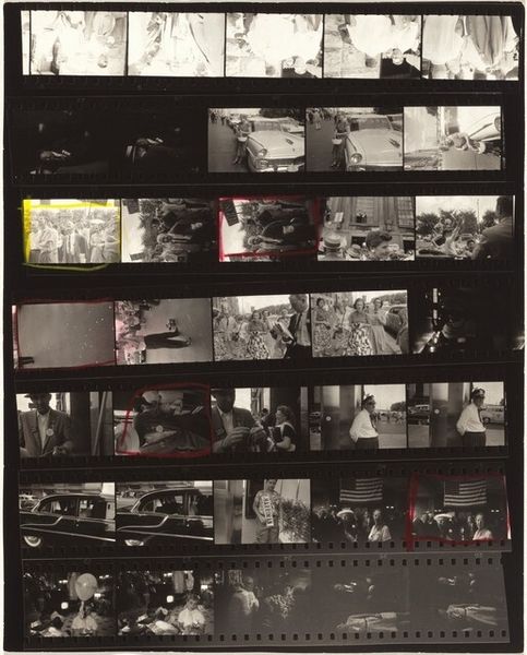Curator: Let’s spend some time with Robert Frank's "Italy 3," a gelatin-silver print from 1964. What are your first thoughts? Editor: It strikes me as quite raw. It’s the photographic equivalent of exposed brushstrokes, offering a peek behind the scenes. The physicality of the medium, the celluloid strip, and silver are laid bare. Curator: It certainly disrupts any notions of photographic perfection, doesn’t it? What are some of the implications of showcasing this entire uncut roll? It reflects the ethos of Post-Impressionism—foregrounding subjective experience and process, it invites speculation about the artist’s experience of place and about narrative interpretation through a collection of juxtaposed images. Editor: Absolutely. We can delve into how Frank’s method—street photography, specifically—conveys social and historical truths. What choices were made? Was it a need for speed in documenting the moment, given his handheld style? Did the economic circumstances influence that process or its aesthetic? The whole piece reveals the nuts and bolts of image production and suggests a kind of anti-elitist approach to art making. Curator: That connects strongly with the sociopolitical themes Frank often addressed. I am drawn to think more deeply about a single chosen image outlined within that visual, temporal grid—its meaning now amplified by association, context, a critical selection amongst many potential photographic works. And of course, with photography, the material always presents the argument of reproducibility; making the moment accessible or allowing further interpretation and reflection. What do you think about these elements of Frank's process and materials? Editor: The gelatine-silver prints themselves become historical objects, embodying the chemical processes of their time. It reveals the history of the analog materials used and hints at questions of conservation. Also, Frank’s rough edges seem deliberate, disrupting the clean lines, smooth surfaces and careful presentation expected in fine art photography. Curator: Exactly! So, both challenging conventional norms and establishing a new visual language. Editor: Indeed. A lasting impression after examining not just the "what" but the "how" and the "why". Curator: A powerful statement on artmaking, visibility, and cultural memory!