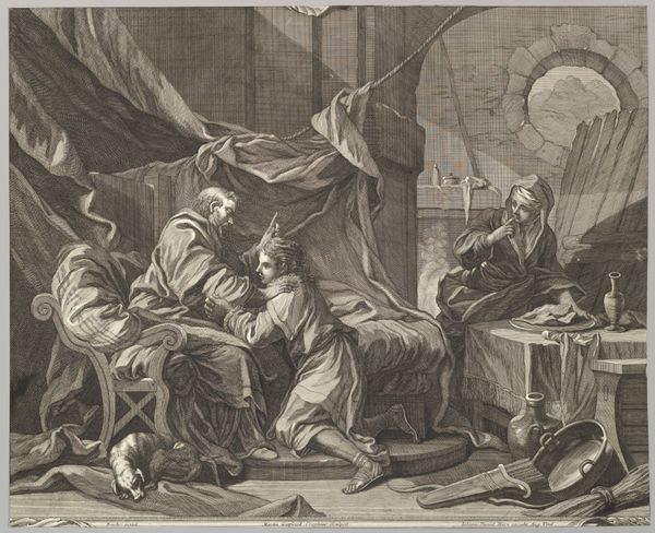Editor: Jacques-Louis David's "Paris and Helen," created in 1786 using charcoal and colored pencil, has this immediate sense of hushed drama. The way the figures are arranged, it’s almost like we've stumbled upon a secret, intimate moment. What do you see in this piece, beyond the obvious beauty? Curator: Oh, far beyond! To me, it’s David wrestling with the burden of history. We’re peering into a scene loaded with consequence, the illicit love affair that launched a thousand ships. But David isn't giving us the sweeping grandeur you might expect. He's chosen a quiet moment. See how Paris seems almost melancholic? Like he knows, deep down, what this will cost. Isn’t that intriguing? He knows this woman is trouble, she is divine beauty... yet also represents war. And the cupid over to the left, with his arrow? It is a beautiful symbol of things to come! It’s not just about love, it's about fate, wouldn’t you say? Editor: That's a fascinating read. I initially just saw it as a classical romance, but framing it as a moment of doomed bliss definitely adds a layer of complexity. Curator: Exactly! David often used these historical settings to explore something much more universal about the human condition. We are at the cusp of the French revolution at this point... and everyone will feel pain! What do you make of that almost stark setting, by the way? Notice the neoclassical, somber furniture? It really allows one to feel all of their emotion at the forefront, doesn't it? Editor: I do, it highlights the gravity of their choice so that is a very valid point that you mention! It’s made me look at the drawing with new eyes, realizing it's much more than just a pretty picture of mythology. Curator: I know! Now you feel my inner passion... which makes us almost complicit, doesn't it? Editor: Indeed. Thanks, that definitely made me feel it more profoundly. Curator: My pleasure. Perhaps too profoundly for Paris and Helen... hopefully it will benefit you on the long run!