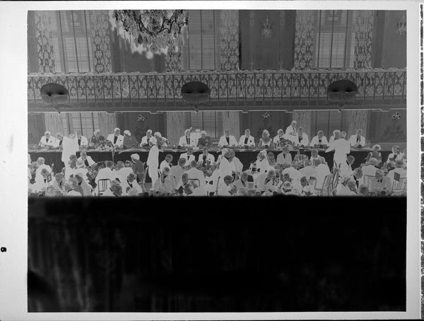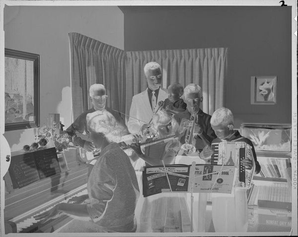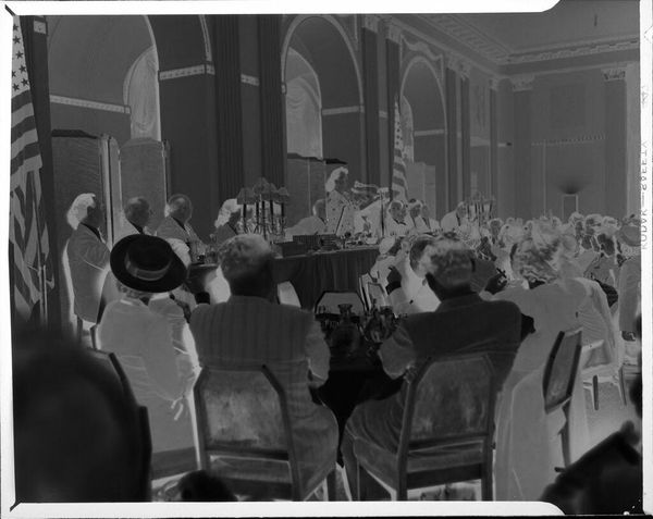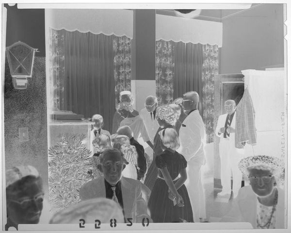 Curator: This photograph, taken by Harris & Ewing, is simply titled “Untitled (business men at meeting).” Editor: My first impression is how the inverted tones give it an eerie, almost spectral feel. What are they up to? Curator: Harris & Ewing were a prolific Washington D.C. photographic studio. This likely depicts a formal gathering, reflecting the political and social landscape of the era. Editor: The repetition of figures, each mirroring the last, evokes a sense of conformity and perhaps the stifling nature of bureaucracy. Curator: Exactly. The image acts as a document of its time, showing us the power structures at play in American society. Editor: It's almost as if the lights above them are symbols of unseen forces. Illuminating, but also imposing. Curator: It provides a stark, yet fascinating glimpse into a world of power and influence. Editor: Indeed. A reminder that these gatherings, though formal, shaped the world we inhabit today.