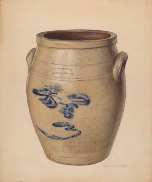 Yolande Delasser created this watercolor titled “Jar”, showing the stoneware object in muted tones against a neutral background. The jar's cylindrical form, softened edges, and earthy palette give it a tactile quality, inviting the viewer to consider its materiality. The visual structure hinges on contrasting the jar’s subdued, almost monastic appearance, with the dynamic, almost playful cobalt blue floral design. This juxtaposition sets up a visual dialogue between utility and decoration, the organic and the manufactured. The dark floral patterns disrupt the jar's otherwise simple form, creating a semiotic tension. Do these elements represent a deeper cultural narrative, perhaps hinting at a transition from functional object to a decorative symbol? This work asks us to consider how everyday objects can become charged with cultural meaning through careful manipulation of form and design. Consider the overall aesthetic tension, as the interplay between form and decoration transforms a commonplace jar into a focal point for contemplation.