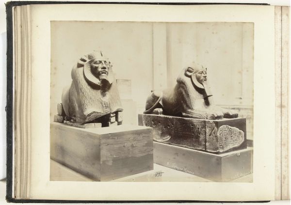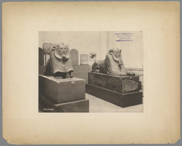 This photograph, titled "Twee sfinxen in het museum van Gizeh," was created by Maison Bonfils. The image presents two sphinxes, each a composite form of human and beast, displayed within the stark geometry of a museum setting. Their solid forms are presented in a monochromatic palette that drains the colour and flattens the depth of the space. The sphinxes are placed on cubic plinths, emphasizing their three-dimensional presence. There is a visual dialogue between ancient and modern, artifact and artifice. The museum's architecture, visible in the background, is suggested by vertical lines that frame the sphinxes. The composition is structured around contrasts. The rounded, organic forms of the sculptures are set against the museum's architectural grid. This arrangement highlights the play between form and function, nature and culture. The photograph doesn't just document; it interprets, inviting us to consider the interplay between the ancient world and its modern presentation.
