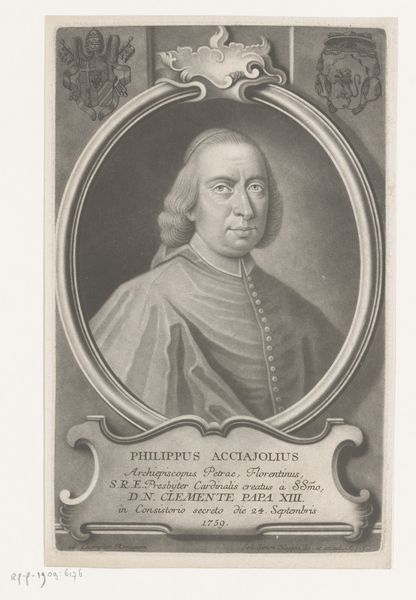 This is Johann Simon Negges's portrait of Giovanni Ottavio Bufalini. The monochrome print utilizes varied shades to convey a sense of depth and texture, an effect heightened by the contrast with the white background. Framed within an oval cartouche, adorned with heraldic emblems, the portrait's structure is a play between the contained and the expansive. The formal rigidity, typical of official portraiture, is softened by the slight asymmetry of Bufalini's gaze. Negges's strategic use of line and shading directs our attention, reinforcing the sitter's status through the semiotics of dress and accoutrements. The frame and text further codify the sitter's identity within a complex web of religious and social hierarchies. This image invites us to decode the visual language of power and representation in the 18th century.
