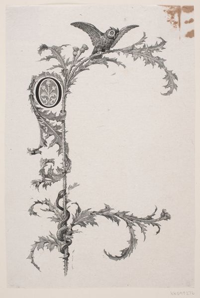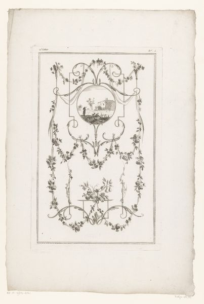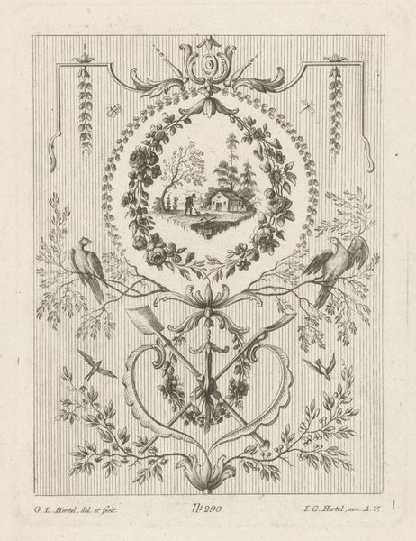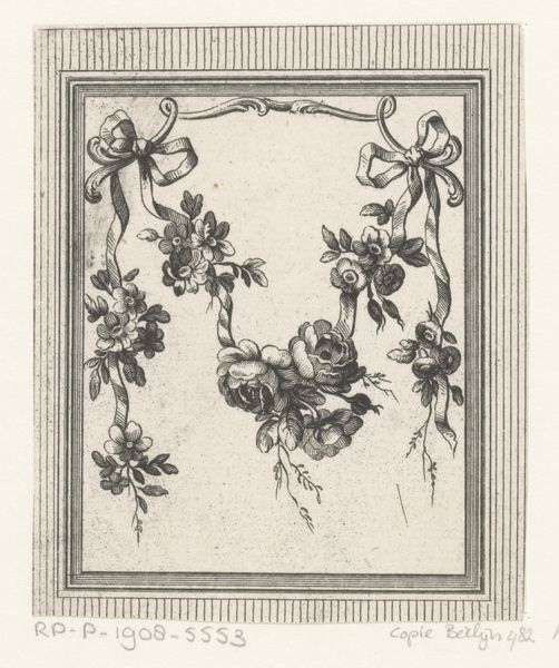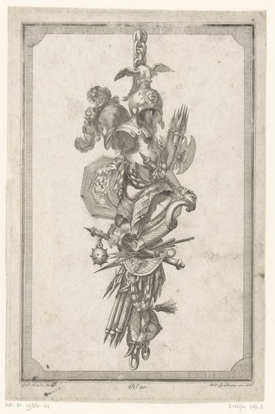 This print, "Pijlenkoker en boog," or quiver and bow, was made by an anonymous artist using the intaglio printmaking technique of etching. The process begins with a metal plate coated with a waxy, acid-resistant substance called the ground. The artist then draws through the ground with a pointed tool, exposing the metal. Next, the plate is immersed in acid, which bites into the exposed lines. Ink is then applied to the plate and the surface wiped clean, leaving ink only in the etched lines. Finally, the plate is pressed onto paper, transferring the image. The fine lines and delicate details of the floral swag and weaponry design demonstrate the level of skill required to control the etching process. The choice of etching, a technique capable of producing multiple copies, suggests that this image was likely intended for wider circulation, perhaps as a decorative element, a source of inspiration for other craftspeople, or as part of a larger suite of prints. Looking at the image this way, we recognize that even seemingly simple images are the product of skillful labor, technical knowledge, and social exchange.