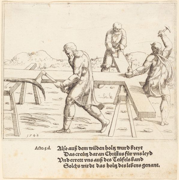 Curator: Augustin Hirschvogel's engraving, "Christ Ascending the Cross with Sin, Death, and the Devil," from 1547, is certainly a striking work. Editor: It’s a profoundly unsettling image, isn't it? The harsh lines of the engraving accentuate the starkness, and that figure struggling up the ladder...heavy with what appears to be death itself. The composition feels burdened, almost as if the medium itself groans. Curator: That sense of burden is quite deliberate. Notice how Christ carries not only the symbolic weight of sin and death represented physically on his back, but is actively engaging with evil in a dynamic ascent. Editor: The ladder is an interesting formal choice; the cross appears almost geometric. It is visually jarring. There's something undeniably unsettling in how rigidly the lines delineate the figure's form against that fairly detailed background. Curator: Indeed, the ladder signifies spiritual striving, but more than this, it is an intentional re-reading of iconography. By showing Christ actively *ascending* the cross, Hirschvogel perhaps visualises a proactive effort against spiritual decline. A symbolic action of choice. Editor: The stark contrasts and intricate detail demand that the eye travel. It is very intentional, even directive, and effectively communicates a narrative charge with considerable intensity. Is the intention of Hirschvogel Baroque in its nature, if only a precursor to what might later unfold into the style more broadly? Curator: Absolutely. You're right to point that out. Remember that the context is still highly symbolic. That river in the background might stand for death as a gateway or the River Jordan as a threshold, if you like. It’s this intertwining of symbols that carries cultural significance far beyond surface aestheticism. Editor: Yes, that intricate backdrop adds a level of complexity, and its details serve the composition; though the backdrop appears rather naturalistic by contrast with what stands as the main feature, it has depth and intentional placement. It serves as a frame almost for what Hirschvogel represents, an effect heightening that very impact you describe. Curator: Precisely. So, while on the surface this looks like a historical illustration of religious triumph, its symbols actively reflect broader societal anxieties. A reflection perhaps on both personal responsibility and eternal consequences. Editor: On balance, seeing it as a piece reflecting those anxieties feels compelling given its artful, yet simultaneously disquieting use of line, contrast and figure. All features work so very harmoniously to that effect.