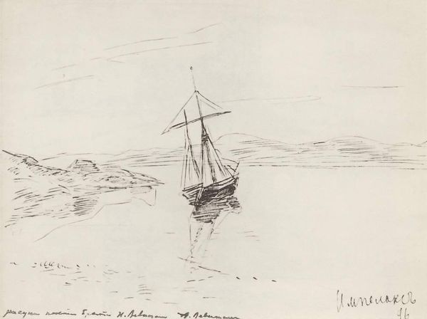 Editor: This is Muirhead Bone's "Cape St. Vincent," a watercolor drawing, probably done en plein-air. The muted colors and the sketch-like quality create such a peaceful, almost wistful mood. What catches your eye about it? Curator: Funny you say that. I’m drawn to the inherent calmness, too. But I see more than just peace; it's the loneliness of the open sea captured in strokes of blue and gray. The little boat sailing off... or perhaps towards land? Does it represent hope or just the relentless journey of life, you know? Editor: I didn’t think of it as loneliness! More like tranquility. But the open-ended narrative is interesting. The lack of vibrant color adds to that, I guess. It almost feels like looking at a faded memory. Curator: Exactly! And Muirhead Bone was working during a time of incredible change and upheaval. You have to think about that context... Did this artistic choice have to do with him processing a world in flux, a personal reflection on time's passage? Editor: So, it's not just a pretty picture but a window into the artist's inner world, filtered through his historical context? I need to remember that. I am seeing this painting now with different eyes. Thanks! Curator: That's the magic of art, isn’t it? To transform not just our view but our feeling towards the world. I learned from you today! Seeing this as a fading memory is the key to look into his spirit!