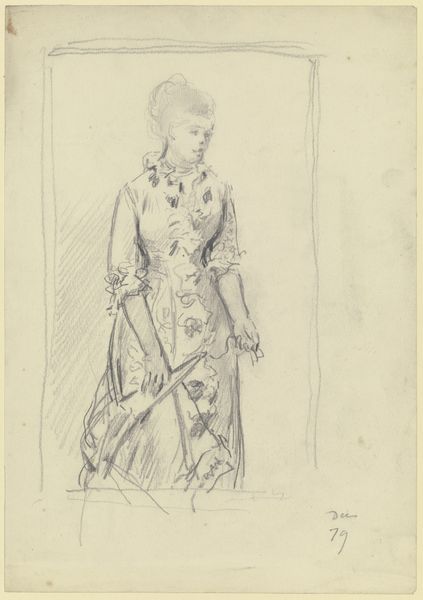 Curator: Here we have Augustin Pajou's drawing, "The Ludovisi Water Carrier," made sometime between 1752 and 1756. It is a compelling example of neoclassical portraiture. Curator: Yes, and my first impression is one of elegant austerity. The limited use of line, the stark monochrome—it all creates this immediate sense of classical restraint and form. Curator: Restraint born from very specific social conditions, though. Neoclassicism in France was, in part, a reaction against the opulence of the aristocracy. The desire was for moral clarity. This image shows us the intellectual work being done by artists to reform the very means of production in line with enlightenment values. Curator: I see your point, the linearity certainly embodies clarity. The drape of her clothing; one almost feels the cool smoothness of the imagined fabric and the weighty roundness of that water vessel resting on her shoulder. It’s all meticulously balanced between naturalism and idealized form. Curator: And note, too, the role of drawing in the period. These drawings weren't necessarily intended as ends in themselves. Rather, we must consider drawing in the broader process that includes sculpture, printing, distribution of prints... How images were used and circulated among different kinds of makers is what I find exciting here. Curator: Agreed. But here the formal qualities suggest more. Consider the pose, recalling classical sculpture while simultaneously achieving a sense of dynamic movement, her contrapposto stance is a masterclass. Curator: These all'antica poses of course became wildly popular as they could serve any patron wishing to position himself or herself in line with a lineage of power—through carefully tailored consumption habits. It really foregrounds the commercial functions that art played. Curator: The piece certainly opens up lines of inquiry beyond mere surface admiration, and perhaps forces us to reconsider this artist’s strategic choices in rendering of the human form. Curator: Indeed. For me, thinking about the networks of labor and production gives this otherwise simple sketch so much nuance and impact. Curator: Absolutely, and the very process of visually disentangling the artwork remains thoroughly engaging. Thank you!