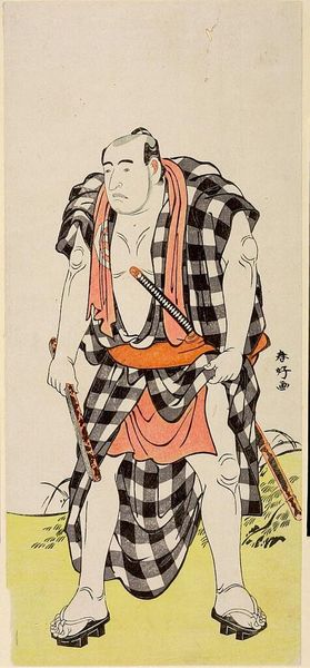 Editor: This is a print of "Actor Ichikawa Danjūrō as a Samurai" by Katsukawa Shun’ei, currently at the Harvard Art Museums. I notice the actor’s intense gaze and the intricate details of his costume. How do we interpret the role of kabuki theatre in shaping cultural perceptions of samurai identity? Curator: Well, the kabuki theatre was hugely influential in shaping, and often mythologizing, samurai ideals for a wider audience. Consider how gender roles are being performed here. This actor, a male, is embodying a masculine figure, yet within the stylized and arguably effeminate conventions of kabuki. What does this tell us about the performance of identity and power? Editor: That’s a very interesting point. It’s like the print is reflecting a reflection, adding layers to the idea of samurai identity. I never thought about it that way! Curator: Exactly. And it speaks to art's power to both reinforce and subvert societal norms. I’m glad we could explore it together!
