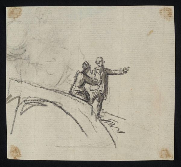 Editor: This intriguing sketch by Joshua Reynolds, titled "Brutus and the Ghost of Julius Caesar," captures a rather tense scene. What symbols stand out to you in this work? Curator: Notice how Reynolds uses the ghost as a symbol of Brutus's inner turmoil. The ghost embodies guilt and the inescapable consequences of actions. How might the figure of Brutus exemplify ambition's dark side, considering the cultural memory of Caesar? Editor: It does seem like Brutus is haunted by more than just a ghost. It's like he's wrestling with his own conscience. Curator: Precisely! The image ties into a long history of representing moral and political conflict through such figures, a tradition Reynolds was clearly engaging with. It's fascinating how powerful these visual symbols remain across time. Editor: Definitely gives you a lot to think about!