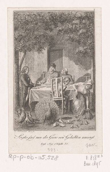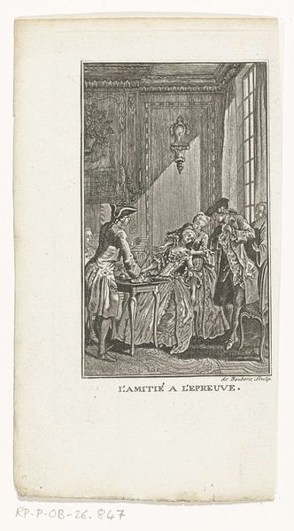 This engraving, titled 'Vaders leerschool' by N. de Boubers, presents a scene dominated by fine, precise lines that define a domestic interior. The texture created by the engraver’s marks gives a palpable sense of depth, drawing us into the intimate setting. The composition is structured around a table where figures gather, their interactions suggesting a narrative. De Boubers uses the linearity of the medium to delineate not just form but also the social dynamics at play. The room’s architecture, with its panelled walls and framed artwork, provides a backdrop that speaks to the cultural values of the time. Yet, it's the strategic arrangement of figures that truly animates the scene. Their placement and gestures, captured with remarkable detail, invite us to decode the relationships and perhaps the ironies inherent in the "school of fathers." Ultimately, the print offers not just a visual depiction but a commentary on social mores, rendered through a structured orchestration of line and form.