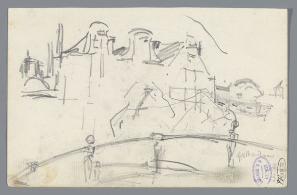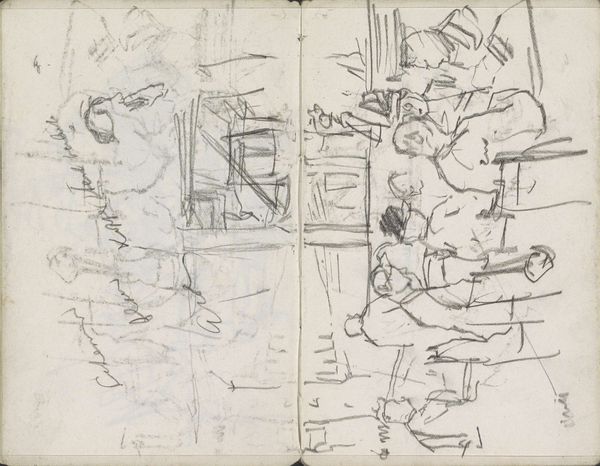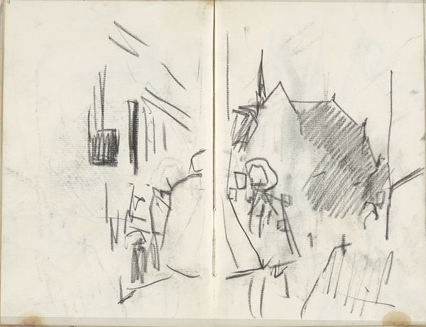 George Hendrik Breitner created this sketch of a view in Amsterdam, possibly the Rokin, using graphite. The drawing presents a fragmented urban scene, capturing a fleeting moment with an economy of line. Breitner focuses on the structural elements of the cityscape. Notice how he employs quick, gestural strokes to define the figures and architectural forms. The composition is divided into two sketch panels, creating a juxtaposition between different spatial perspectives. The sketch uses a semiotic system of signs – the rough lines suggesting movement, the dark shading implying depth. There is a dynamic interplay between presence and absence, with details emerging from a field of white. This approach challenges traditional modes of representation, favoring instead the immediacy of perception. The artist invites us to contemplate the provisional nature of experience and representation. Through its structural composition, the sketch prompts a deeper understanding of how urban environments are perceived, documented, and interpreted.