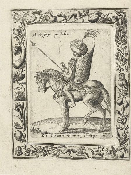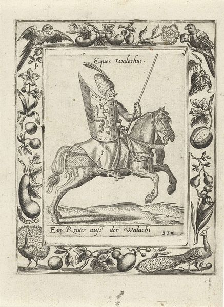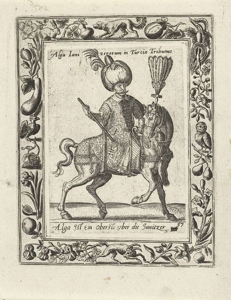 Editor: Here we have Christoph Krieger’s "Beglierbei della Natolia," created in 1598. It’s a woodcut engraving printed in ink on paper. Looking at the image, I'm struck by the formality and detailed rendering of the rider and the horse. It's like a snapshot frozen in time. What draws your eye when you look at this work? Curator: Oh, this piece sings to me of narrative, even a touch of the performative. The very stiff formality you noted, yes, but beyond that there's an attempt at portraying power, isn't there? This "Beglierbei," or Beylerbeyi, meaning commander of commanders, seems almost burdened by his armor, and perched precariously on that stiff-legged horse. Makes you wonder about the propaganda machine of the 16th century, eh? Does he look invincible to *you*, my friend? Editor: I can see that! It's not exactly a dynamic image. It’s powerful, but very static. He does look kind of awkward. Perhaps this woodcut was made to communicate power, not to depict it accurately. It’s a piece from the past with a clear intention. Curator: Precisely! The fascinating tension between intent and execution...makes you consider the 'why' beyond the 'what,' eh? Perhaps a subtle jab at the portrayed authority. Editor: It's definitely made me think more critically about historical representation. The detail, I see now, could easily obscure a more complex reality, but a reflection upon what this piece might signal…thanks! Curator: Glad to add a slightly different tint to your view. Always remember: art whispers, sometimes screams... but it *always* speaks, and we get to eavesdrop.