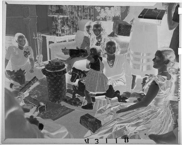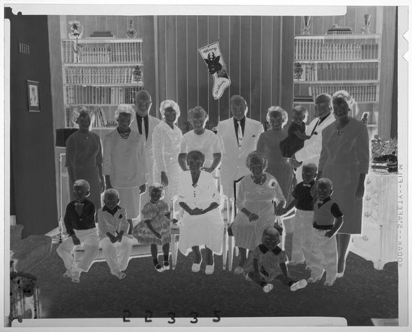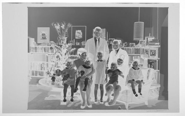 Curator: Martin Schweig's black and white photograph presents a family portrait, "Untitled (twelve members of family lined up from tallest to shortest looking to right in living room)." The linear arrangement immediately strikes me. Editor: Yes, the strict ordering feels almost ritualistic, doesn't it? Note the father or elder in his crisp uniform, anchoring the line. Curator: The repetition of faces, arranged according to size, is the key structural element. The image plane is almost mathematical. Editor: Indeed, but more than math, I see echoes of social structure, of inherited roles and expectations. The line itself suggests a progression, a future unfolding. Curator: Perhaps, but the formal properties—the tonal range, the precise arrangement—these, for me, are the essence of the work. Editor: And for me, it's the emotional resonance, the subtle anxieties and aspirations captured in their collective gaze, that make it so compelling. Curator: I appreciate the interplay between form and feeling. Editor: Exactly, a dialogue between past and present, personal and collective.