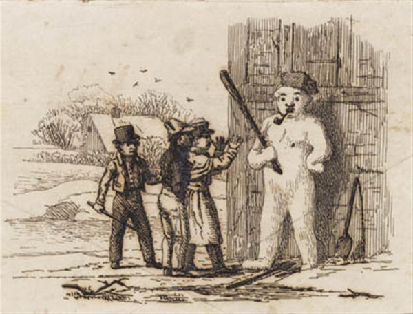 Curator: Here we have an engraving by Martinus Rørbye, dating to 1834. It is an illustration for "Halvhundrede Fabler for Børn" or "Fifty Fables for Children" by Hey. Editor: Well, isn't this charmingly peculiar! A snowman with a rather severe expression confronts three boys who appear equally bewildered. The light is wonderfully soft, giving the whole scene an ethereal glow. Curator: Yes, Rørbye was a key figure in the Danish Golden Age and this is very representative of Romanticism, a blend of genre painting and narrative. It’s interesting how he uses such a precise, almost scientific engraving technique for a children's illustration. He likely sought to depict something from everyday life with the available materials in his reach. Editor: Precisely. You feel the weight of those tiny lines making up the form. The snowman, the makeshift materials, even the children's slightly stilted postures—they all contribute to this strangely haunting quality. Curator: The medium itself tells a story, right? An engraving would allow mass production and broader dissemination of these fables to reach the burgeoning middle class in 19th-century Denmark. It democratized access to both art and literature, serving an educational function beyond mere aesthetic pleasure. Editor: True. It almost feels as if we're catching a moment suspended in time, as if that very scene will soon disappear, ephemeral just as snow. You think they know that their creation won't survive, that even stories can be altered by their telling? Curator: Perhaps Rørbye is hinting at the transience of childhood itself. It’s intriguing to consider the labor involved: the physical act of carving, inverting the narrative from ephemeral to materially recorded through this medium, preserved by institutions like the SMK. Editor: Yes! You almost hear the faint scratch of the engraving tool meeting the metal. What lingers is a beautiful paradox – capturing ephemerality with incredible enduring artistic method. I keep wondering if these lads know their fleeting joy has been immortalized? Curator: Quite so. It gives new context to their frozen tableau of bewilderment doesn't it?