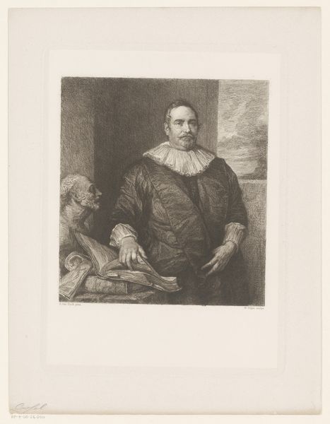 Lucas Vorsterman I created this portrait of Philippe Le Roy using engraving, a process mirroring the precision and control that defined the era's social hierarchies. Consider the gaze of Le Roy, his clothing, and even the presence of the dog, all symbols of status and masculinity in the 17th century. What does it mean to perform this kind of identity, and how does it play into the dynamics of power and privilege of the Dutch Golden Age? The fine details achieved through engraving highlight the textures of wealth and the sitter's confident stance within his social world. The artist's hand, guided by the demands of representation, captures not just an image but a construct of identity. Le Roy, through Vorsterman's skill, presents himself to the world and to posterity, in a carefully curated display of power.