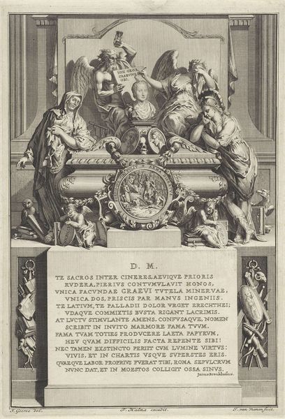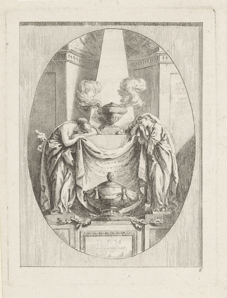 Curator: I’m struck by the way this drawing captures such a fleeting, delicate atmosphere despite being a monument design. There's a strange intimacy. Editor: Indeed! What we're looking at is a work by Bartholomeus Ziesenis, possibly from 1806, entitled "Ontwerp voor een monument voor C. Brunings: een borstbeeld in een nis," or "Design for a monument to C. Brunings: a bust in a niche". Ziesenis used pencil on what appears to be toned paper. Curator: Toned perfectly, might I add, to whisper stories of time! It’s like looking at a faded memory, sketched on parchment kissed by centuries. And those cherubs holding the inscription... they have this almost mischievous glint! Editor: The Neo-classical style is certainly playing with established visual cues here. Ziesenis utilizes a visual language typical of commemorating prominent figures, adapting it into something uniquely personal. C. Brunings was a water engineer, and the monument serves as a recognition of his important public role. Curator: Water engineer, eh? That explains the almost ethereal quality I sense! The sketch, so light and airy, it almost evokes the fluidity of water itself. But tell me, does this design feel…conventional for its time? It’s beautiful, but does it break any molds? Editor: That's the curious aspect, isn't it? The intent behind these monuments, and how much personality they incorporate...it seems almost contradictory, a tension between expressing genuine public feeling and performing civic duty. While it follows some Neoclassical conventions, its sketch-like nature suggests an initial, perhaps more experimental vision. Curator: Hmm. More a prelude than a full performance, you might say! Well, it certainly has struck a chord in me. Thank you for elucidating its history. I shall depart with a newfound appreciation of civil engineers memorialized with mischievous cherubs! Editor: It seems this artwork succeeds, at the very least, in bringing forth these considerations of memory, artifice and public acknowledgement.