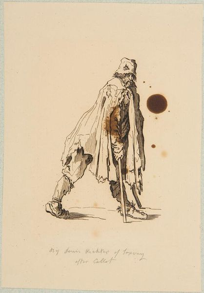 Editor: This is Adrian Ludwig Richter's "Beggar on Crutches Wearing a Hat and seen from Behind," after Callot. It's a simple drawing, but the figure's posture really conveys a sense of hardship. What do you see in this piece? Curator: It powerfully depicts the intersection of poverty and disability. Richter, working after Callot, echoes the latter's commentary on social stratification. The beggar's turned back denies us easy access, challenging the viewer's gaze and prompting questions about who is seen, and who is ignored, by society. Editor: So it's less about the individual and more about the system? Curator: Precisely. The work invites us to consider the systemic forces that create such marginalization, and how we might disrupt them. Editor: That gives me a lot to think about. Thanks! Curator: My pleasure. Art should always challenge our perceptions.