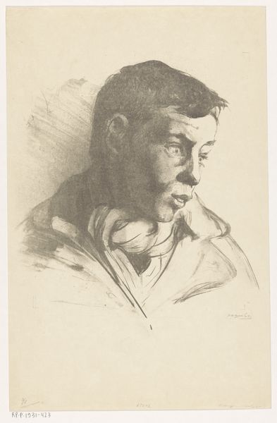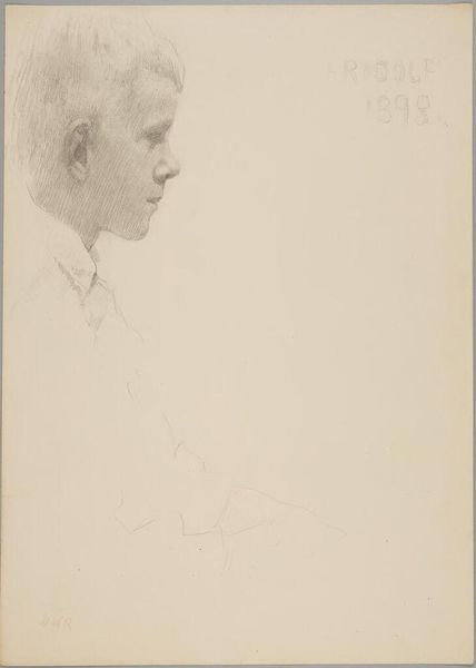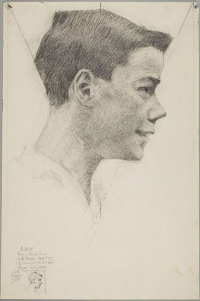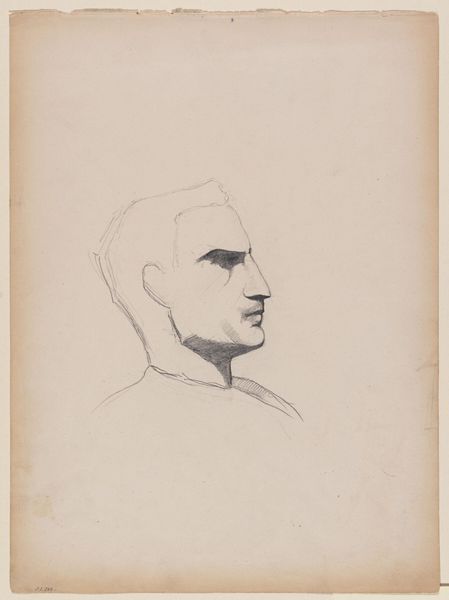 Curator: Looking at this drawing, "Male Head in Lost Profile" by Denman Waldo Ross, currently residing at the Harvard Art Museums, my first impression is one of vulnerability. Editor: The downward gaze certainly contributes to that feeling. The lost profile, as the title suggests, feels introspective, almost melancholic. I wonder if the artist intended for the subject to embody a sense of quiet contemplation. Curator: Possibly. It’s worth noting that Ross was deeply influenced by aesthetic theories emphasizing harmony and balance. Could this "lost" profile be an intentional exploration of the psychological state achieved through detachment? Editor: That's insightful. The positioning could also symbolize the subject’s disconnection from the external world. Notice how the sharp lines and shading give the face a chiseled, almost classical quality. This draws connections to the tradition of idealized male portraits while simultaneously suggesting a modern sense of alienation. Curator: Exactly. By placing this figure within a larger artistic lineage, while emphasizing a feeling of modern isolation, the artist really invites the viewer to make a critical connection with the piece. Editor: It’s a subtle but powerful interplay of historical and contemporary themes. Curator: Indeed.