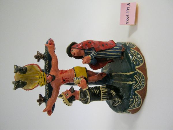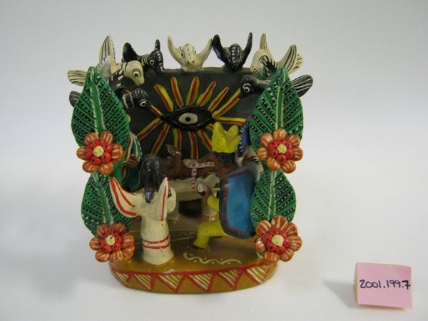 Curator: This is an interesting ceramic sculpture called “Day of the Dead Group,” dating back to the mid-20th century. Editor: Macabre! In the best way possible, though. There’s a festive morbidity that immediately jumps out, a darkly celebratory energy. Curator: Indeed. It reflects the folk art traditions deeply intertwined with the Day of the Dead celebrations. Look at how the figures are presented—bright pigments highlight a scene with skeletal and monstrous figures, embodying cyclical themes of death and rebirth. Editor: What's fascinating is the implicit power dynamic presented. We see some monster figures riding what seems to be a cart being pulled by a donkey while being straddled by a helpless smaller figure. There are hints of social stratification rendered in the bright ceramics and vivid colors. What cultural narratives are really being memorialized? Curator: That’s insightful. The imagery draws upon pre-Hispanic and colonial symbolism, a syncretism typical of Mexican muralism and folk art traditions. Consider the monsters—do they serve as psychopomps guiding souls, or reminders of mortality's pervasive grip? Editor: Maybe both! The juxtaposition isn’t incidental. Ritualized grief doesn't operate outside larger contexts of violence and economic struggle. Curator: Agreed. How does it all intersect, the religious, the social, and the personal? This piece reminds us that symbols evolve, taking on layers of meaning over time. Editor: Absolutely. It pushes us to engage with cultural memory—what stories do we tell ourselves about the past, and how do these inform our present understanding of death, life, and the structures that bind us? It all feels quite visceral, actually, despite the miniature scale. Curator: Precisely. I find the piece to be a fascinating material representation of our enduring dialogue with mortality. Editor: For me, it's the intersectional themes of life, death, and power. The art serves as a powerful lens through which we can question, critique, and, perhaps, find a renewed appreciation for cultural inheritance.