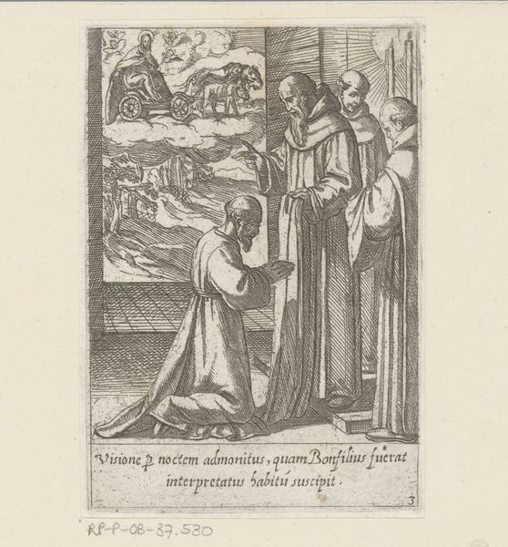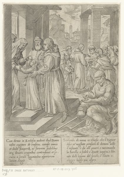 Antonio Tempesta created this engraving, "H. Antonius ontvangt brood van de monniken," sometime between 1555 and 1630. The composition, rendered in detailed lines, draws us into a scene of monks offering bread to a haloed figure, presumably Saint Anthony. Notice how Tempesta uses line to create texture and volume. The monks' robes are intricately detailed. The scene is bisected by strong verticals of the doorway, yet softened by the landscape backdrop, a curious blend of architectural structure and organic form. Tempesta plays with the semiotics of space, dividing the world into zones of activity. The foreground is crowded with figures. The background is sparsely populated, suggesting a path to solitude. This division reflects a broader artistic and philosophical concern with the contrast between communal life and individual spiritual journeys. Ultimately, the stark lines and careful composition invite us to decode the underlying symbolic structures.
