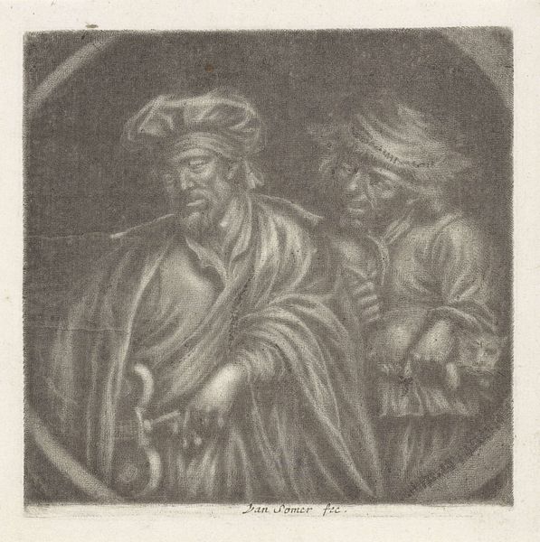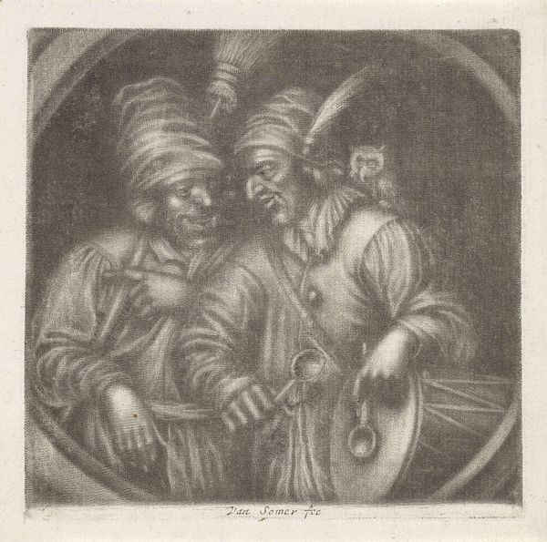 Jan van Somer created this print, depicting a violinist and a flutist, using etching and engraving. These methods are all about controlled mark-making, building up the image line by line. Look closely, and you can see how the crisp engraved lines define the figures, contrasting with the softer, textured areas created by etching. This combination speaks to a moment when printmaking was becoming increasingly sophisticated, a craft elevated by skilled artisans. Van Somer wasn't just reproducing an image; he was orchestrating a performance on the copper plate itself. Consider the labor involved, the meticulous work of cutting lines into metal. This was a commercial medium, meant for distribution, but it also demanded a highly trained hand. By appreciating the materiality and process, we recognize that printmaking is not just a means of reproduction, but a creative practice with its own rich history.