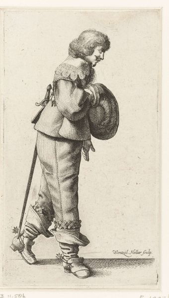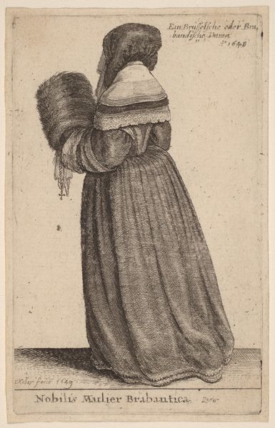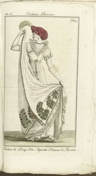 Curator: Elegentia, of tijdschrift van mode, luxe en smaak voor dames. What strikes me immediately about this engraving, created in October 1807, is its exquisite rendering of texture through such fine lines. Look closely at the delicate fabric folds of her dress and the elaborate floral ornamentation. Editor: My first thought is restraint, a certain coolness. The neutral palette contributes, of course, but also the woman's demure posture and averted gaze. It speaks volumes about the performative expectations placed on women, even within elite circles, during this Neoclassical period. Curator: Indeed, though one must also consider the means of production here. The relative inexpensiveness of printmaking made these images accessible, playing a vital role in disseminating trends and driving the textile industry and related material trades. Editor: Precisely. The "luxury" advertised by "Elegantia" wasn't abstract. It hinged upon the labor and exploitation underpinning the material conditions. Who was producing these fashionable items? Under what circumstances? Were women like the one depicted consuming or creating these objects of luxury? Curator: Good points. Focusing on craft and materiality also reminds us to consider what went into creating the image itself—the engraver's skill, the ink and paper used, all components available for analysis. Editor: By the looks of the text, we could dig into issues around literacy and language as it relates to class. What sort of woman is able to read the publication this print comes from? How are dress and class related to power and freedom of expression? The composition of this picture is a cultural expression, both on paper and in practice. Curator: Thank you for the interesting questions that will leave all who consider this engraving much to contemplate. Editor: I appreciate the reminder to question the surface, considering not only beauty but the realities embedded within it.