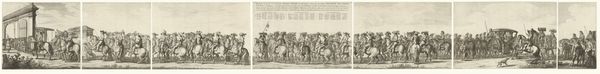 Curator: This is an engraving titled "Vertrek van het Spaanse garnizoen uit Huis te Gennep", or "Departure of the Spanish garrison from Huis te Gennep", created in 1641 by Balthasar Florisz. van Berckenrode. It captures a specific moment in Dutch history, marking the end of Spanish occupation. Editor: Wow, my first thought is just how incredibly detailed it is! Even at this small scale, I can practically feel the weight of those banners and hear the clatter of hooves on the road. There’s almost a somber, reflective quality to the scene, don’t you think? Curator: I do. It's fascinating to consider the symbolic weight this event held. The departure of the Spanish garrison represented a shift in power, resonating deeply with Dutch aspirations for independence during the Eighty Years’ War. You see it visualized as a meticulously ordered departure. Editor: Exactly! And it really speaks to the artist’s skill, capturing not just the literal departure, but the underlying power dynamics at play here. Are these proud victors or humbled defeated soldiers? Curator: The composition leads one to conclude defeated. The engraving provides us with a lens to examine military occupation in the 17th century through the specific lens of Dutch nationhood, which certainly adds layers of meaning when you consider its place within the Rijksmuseum collection. Editor: I love how historical art like this offers a way to access past emotions, political strategies and anxieties. Thinking about what it meant for people then compared to now...It is a kind of haunting echo. Curator: Absolutely. Understanding this artwork necessitates grasping the historical climate surrounding Dutch nationhood. Art becomes an invitation for re-evaluating these moments, engaging the long history of imperialism. Editor: Seeing such painstaking rendering with lines really does get you in touch with history. Thanks for making those connections to the piece’s context; otherwise I would’ve only been stuck with my feelings. Curator: Precisely, and that’s what makes art viewing such an enriching dialogue: historical context meeting the imaginative, personal response.