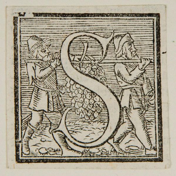 Curator: This woodcut, titled "Letter S," presents a compelling image despite its unknown origin. Editor: Immediately, the density of figures and dramatic gestures evoke a sense of fervent activity. Curator: Indeed, the composition uses the letterform to cleverly frame a narrative scene. The dense hatching creates a dynamic interplay of light and shadow. Editor: The kneeling figure within the 'S,' juxtaposed against the crowd, brings to mind themes of supplication or perhaps judgement before a throng of witnesses. Curator: Precisely. The artist uses the structural rigidity of the letter to emphasize the human drama, creating a compelling tension. Editor: The image speaks to the potency of symbols and collective emotions. It's a striking condensation of social dynamics. Curator: I agree. The stark contrasts and formal economy heighten the visual impact. Editor: A small yet potent piece, leaving much to consider about the human condition. Curator: A fascinating case study in form and content, indeed.