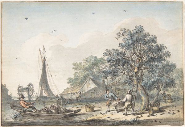 Editor: John Thomas Serres' watercolor, "Dutch Coast Scene," shows us a slice of 18th-century maritime life. I’m struck by how tranquil it feels, despite the implied labor of the man pushing the boat. What catches your eye in this piece? Curator: For me, it's the quiet drama of the ordinary. The man, almost a silhouette, anchors the scene while the windmill and boats whisper tales of trade and travel. It's a memory, a fleeting moment captured in delicate washes. Does it evoke a sense of nostalgia for you too? Editor: Definitely, a yearning for a simpler time. It makes you wonder about his life, the cargo on those ships, the stories behind them. Curator: Exactly! It's an open invitation to dream, isn't it? Art like this is a gentle reminder that every life, every scene, holds poetry if we only pause to see it.