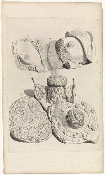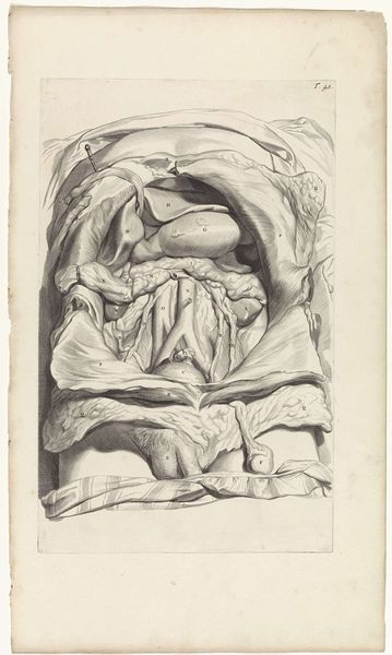 Editor: Here we have "Anatomische studie van het heilig been en het staartbeen," from 1685, by Pieter van Gunst. It's currently held at the Rijksmuseum. Looking at this drawing, I’m immediately struck by the almost clinical precision of the lines, juxtaposed with the soft, draping cloth. How would you interpret the artist’s approach to this piece? Curator: This work stands out because it transcends simple anatomical illustration. Notice how van Gunst meticulously renders the bony structures using a tight, controlled linework. But observe how the use of the drapery complicates our perception, blurring the distinction between scientific representation and artistic expression. Consider how van Gunst’s choice of the aged paper contributes to a sense of history, a layering of time onto the scientific gaze. Editor: So you're saying that it's more than just about the bones themselves; it’s about the contrast between the hard and soft elements and maybe even about the passage of time? Curator: Precisely. Examine how the strategic placement of the fabric enhances the three-dimensionality of the bone. Also note the almost sculptural quality achieved through light and shadow. Van Gunst is employing artistic strategies that elevate the study to a level of aesthetic contemplation. What function, then, does each compositional element serve within the artistic totality? Editor: That’s a great point. I hadn't considered the "why" behind each artistic choice so directly. Curator: Thinking structurally, we see an interesting dynamic between objective subject and artistic intervention. Now, can we say the anatomical subject solely dictates form here? Or does Van Gunst interject meaning through more self-aware, stylized form and technique? Editor: This really changes my perspective on scientific drawings. Thanks for that deeper look! Curator: The pleasure was mine. It’s through such visual decoding that we can begin to unravel the artist’s underlying intentions.