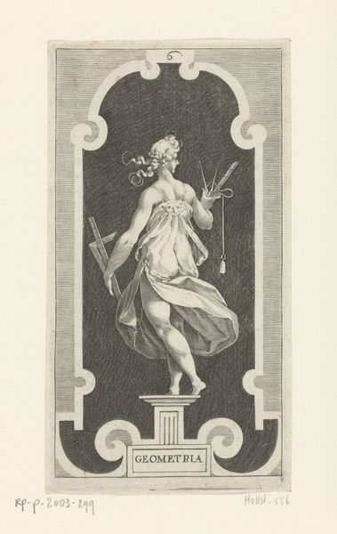 Editor: This is Célestin Nanteuil’s “Title Page for the Revue de Peintres,” created in 1835. It’s a print, so it must be a drawing that was then reproduced. I’m struck by how the central figure, presumably an allegory of painting, is both idealized and quite sensual. How do you interpret this work? Curator: That’s a great starting point. Consider the period – 1835. We're in the throes of Romanticism, yet seeing the rise of industrialization. What does it mean to idealize the artist in a rapidly changing society? This female figure is poised and serene, but what societal expectations and limitations were placed on women, particularly women artists, at this time? Editor: That's true. She's holding a palette, a symbol of her agency, yet her pose also feels somewhat… passive? Was this perhaps a comment on the limited roles available to women artists even within the supposedly progressive Romantic movement? Curator: Precisely! Notice how she is framed—almost literally, on a pedestal. Who gets to define what "art" is, and whose perspectives are privileged? The "Revue des Peintres," whose title appears at the bottom, would have been part of that discourse, setting aesthetic and cultural values, while either including or excluding marginalized voices. How does the gaze, here, function in establishing those cultural norms? Editor: I hadn’t considered it that way, but it's true. By idealizing her beauty, does it subtly undermine her authority as a creative force? Maybe it perpetuates a limited view of women’s roles in the arts. Curator: It could. Exploring how she is presented vis-à-vis the text itself is valuable to consider here. The decorative elements both elevate and enclose her, and could also hint at the commercial and patriarchal framework around artistic practice. Editor: So it is less about individual artistic expression and more about the social context shaping it. I learned a lot; thank you! Curator: Likewise. Thinking about art through these lenses allows us to appreciate not just the skill, but also the silent dialogues it holds with the world around it.