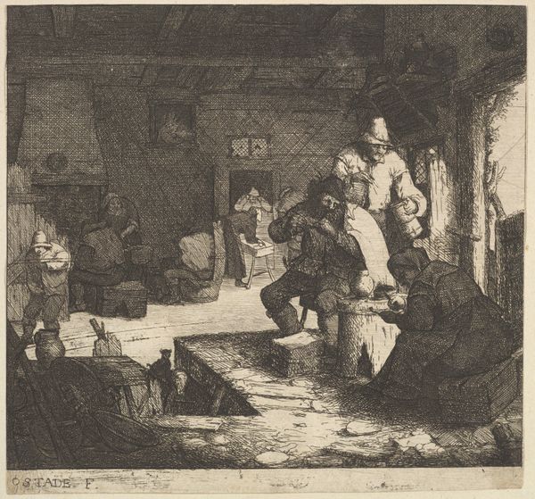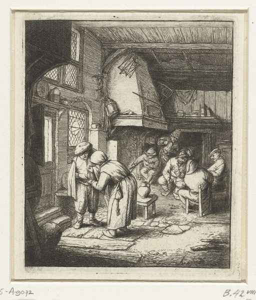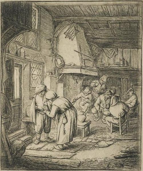 Editor: We're looking at Adriaen van Ostade’s etching, "Peasant Paying his Bill," created sometime between 1610 and 1685. The tiny details depicting this tavern scene are fascinating! But I am most struck by the interior; there is such a strong diagonal between the dark hearth in the background and the patrons and the brighter doorway in the foreground. What's your initial reaction? Curator: You know, it's that light, isn't it? The way it slices across the scene, drawing us into the transaction at the door. Van Ostade was a master of capturing everyday life, and this scene is so richly rendered, you can almost smell the beer and hear the chatter. For me, it's not just the composition but the feeling that Van Ostade transmits; an authentic portrayal of these figures, their humanity rendered palpable. Don’t you think? Editor: Yes, it does feel immediate! It is easy to feel as though we’re intruding, spying, somehow. Does that feeling connect to the genre somehow? Curator: Precisely! Genre painting is rooted in close observation, an attempt to reveal a truth, not unlike what you expect from good investigative journalism. With "Peasant Paying His Bill", Van Ostade almost invites us to partake in a clandestine peek into everyday life. We get the joke. I imagine this scene unfolded more times than he could possibly etch. Editor: The amount of activity packed into such a small image makes it really exciting to analyze, it invites you to linger. Curator: It’s true. Each little mark, each choice, creates this miniature world, so full of implied narratives! Thanks, this viewing made me see Van Ostade anew. Editor: And I learned more about genre painting! A great discovery!