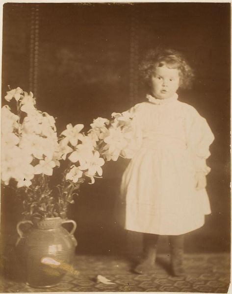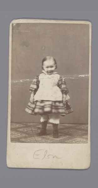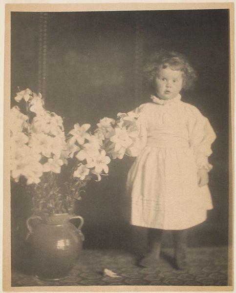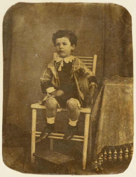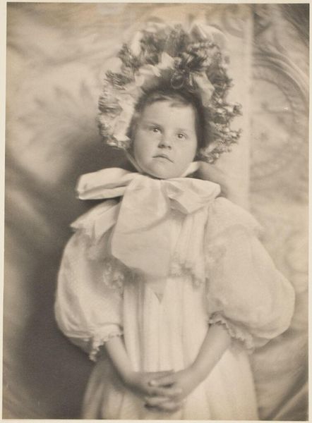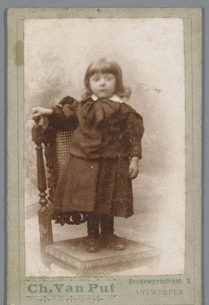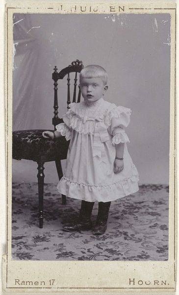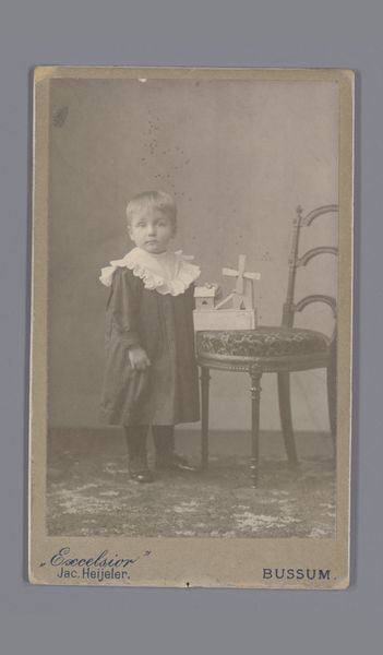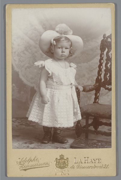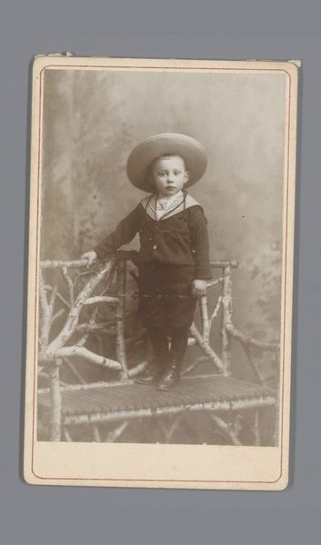 Curator: Here we have "Portret van een kleine jongen met een hoed, staand op een stoel," or "Portrait of a young boy with a hat, standing on a chair," created around 1913 or 1914 by American Automatic Fotografie, currently held in the Rijksmuseum's collection. Editor: My first impression is one of delightful artificiality. The stark backdrop, the child posed stiffly on the chair... it all speaks to a performative kind of innocence. Curator: Precisely! The photographic process itself in that era dictated a certain stillness. Observe the tonal range—the almost uniform gray, punctuated only by the crisp white collar. Semiotically, the limited palette focuses the viewer’s gaze entirely on the subject’s form and costume. Editor: Costume indeed. That oversized hat and lace collar seem less about reflecting authentic childhood and more about projecting a specific social identity. Perhaps the parents wanted to display prosperity or aspiration. It's fascinating to consider the societal pressures reflected in this constructed image of youth. Curator: And how that costume interacts with the spatial relationships within the photograph. The boy’s stance, leaning on the ornate chair, disrupts any simple reading of youthful playfulness. The chair, painted white, acts as a vertical, directing the eye and creating contrasting segments in the arrangement, dividing the frame and interrupting an otherwise predictable symmetry. Editor: Do you think the setting, the photographic studio in Amsterdam around 1913-1914 would impact the perception? Studios democratized portraiture to some degree, making these staged moments accessible to a broader section of society and reinforcing aspirations or social belonging, yet the final product retains a certain formality that marks the sitter as distinct, as noteworthy. Curator: The very nature of the photographic medium, regardless of its democratization, presents the self as something carefully crafted for an audience. This, along with attention to light and tonality elevates what could have been a document to the status of 'art'. It speaks, at its essence, to an almost theatrical presentation of self. Editor: Absolutely, and analyzing photographs like these offers a fascinating window into understanding a time, people, and technology of making a representation of the world, where a young boy on a chair says far more than it initially seems. Curator: Indeed. From the angle of strict visual analysis and the interplay of its formal elements we arrive to appreciate an object that transcends mere visual description.