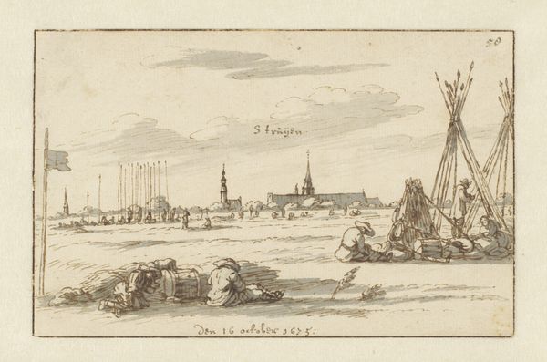 Editor: So, here we have Jacob Esselens' "The Old Marina of the Amstel in Amsterdam," created in 1658, using pen and Indian ink. It feels so understated, almost like a quick sketch. What can you tell me about it? Curator: Well, let’s start with what it is: a drawing. But is it "just" a drawing? Look at the details Esselens renders with such minimal materials: pen, ink, paper. He captures the Amstel harbor, not as some romantic vision, but as a working space. What does that tell us about the function of art within 17th-century Dutch society? Editor: I guess I hadn't thought of it as a "working" space before, more of a scene. So you are saying its function moves beyond aesthetic pleasure? Curator: Exactly! The choice of humble materials like pen and ink suggests that this piece was meant to depict the everyday life and activities in the port rather than idealize or glorify it. Who owned this image? What did they DO with it? These questions direct our analysis toward class and labor in Dutch society, beyond "high art" that often depicts royals or religious subjects. Does the depiction of labour offer social commentary? Editor: Interesting, I was only thinking about composition and style! But what about its monochrome nature, doesn't that relate more to artistic style than the means of production? Curator: Maybe, but also what materials were available, and their cost. The ink is meticulously applied, suggesting value of labor. This challenges hierarchical art systems. Editor: I see what you mean! Examining its material context opens up so many more avenues of thought than just considering the subject or aesthetics alone. Thank you. Curator: Indeed. Recognizing the labour, materiality, and purpose moves us beyond appreciation of aesthetic. I will continue to keep this in mind.