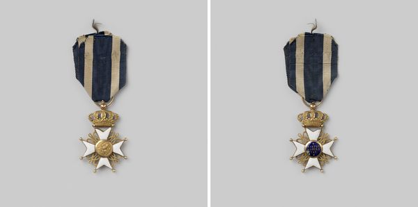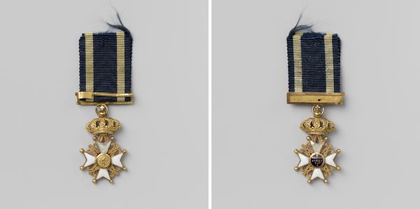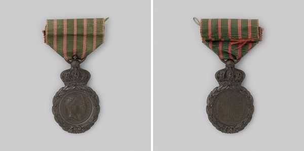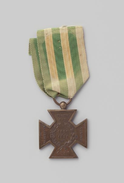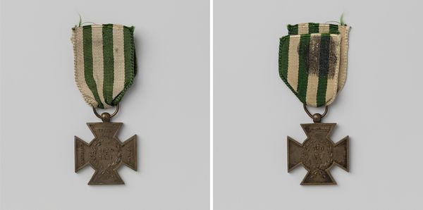 Curator: Well, this small metal object carries immense historical weight. What we're seeing is the 'Metalen Kruis,' or Metal Cross, a bronze medal dating back to 1830-1831. It's an anonymous work, which somehow adds to its poignancy, don't you think? Editor: Absolutely. Immediately, I am struck by the slightly worn fabric ribbon attached to the cross. Its age suggests endurance and reminds me of how tangible objects become vessels of intangible cultural memory, even…heroism? Curator: Indeed. This particular medal was awarded to those who fought in the Ten Days' Campaign, a brief but significant conflict during the Belgian Revolution. Consider it as a material expression of nation-building and patriotic sentiment. Editor: You know, the cross as a visual symbol is endlessly compelling. It carries so much pre-existing meaning, yet here it is, adapted to symbolize military honor and sacrifice. The symbolism of bravery becomes intertwined with a visual form representing deep faith. Curator: Precisely. And examine the wreath of oak leaves and laurel encircling the inscription on the medal's face. This invokes classical ideals of victory and strength, grounding a contemporary event in a much longer historical narrative. Note how, symbolically, it speaks to notions of justifiable governance. Editor: Right, these visual languages always evolve to communicate what's significant to a specific time, what a state wishes to memorialize and embody. The slight tarnish and wear only enhance that story, lending the object authenticity and gravitas. Its imperfect state communicates how history has treated those it ostensibly enshrines. Curator: And its imperfections remind us of the very human stories behind grand historical narratives. This is a piece that truly bridges personal sacrifice with broader political developments. Editor: Absolutely. This humble cross speaks volumes, doesn't it? It helps reveal what symbols endure through time. Curator: Indeed. It's an evocative glimpse into the way societies memorialize, celebrate, and even manipulate history.