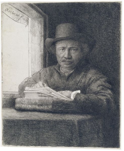 Rembrandt van Rijn made this self-portrait in etching sometime around 1648, during the Dutch Golden Age. The image presents the artist in a domestic setting, leaning on a windowsill with drawing implements at hand. Sunlight streams in, illuminating his face and working materials, while the rest of the scene remains in shadow. This dramatic lighting is characteristic of Rembrandt, but here it also speaks to the social position of the artist. In 17th-century Holland, artists were becoming increasingly independent of aristocratic or ecclesiastical patronage, relying instead on the open market. Here, Rembrandt seems to be presenting himself as a craftsman, making his living by the light of his own labor. To understand this work more fully, we can consult archival records of the art market in Amsterdam, as well as the inventories of artists' studios. By examining the institutions and economic conditions that shaped Rembrandt's career, we gain a deeper appreciation of the social meaning of his art.