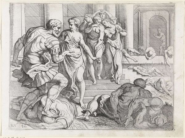 Editor: Here we have an engraving, likely made sometime between 1650 and 1700, called "The Return of the Prodigal Son." What I notice first is how detailed the rendering is despite being a print. What's interesting is how the figures become smaller in the background; I wonder if that has any specific symbolic meaning here? Curator: More interesting is that this work engages with production beyond a single artist's hand. As a print, its very existence points to dissemination and consumption. Let's consider the labor involved – the engraver who transferred an existing image and, further, the socio-economic context. Editor: That's a different perspective than I usually take. How does the “means of production,” as you put it, speak to the meaning of the work? Curator: Well, think of it this way: prints democratized art. What was once accessible only to the wealthy could now reach a broader audience. An engraving such as this becomes a commodity circulating in a market, rather than solely an act of artistic creation. Editor: So, by focusing on its creation as a product, we see that the print changes how art is available. Are you saying its meaning changes when art moves from an elite thing to something more accessible? Curator: Precisely! The narrative itself is secondary to the shift it represents in art production and consumption. The religious narrative becomes a vehicle. Even the choice to work within the well-worn, familiar baroque style aligns this engraving with other such pieces available in the period, which also played a crucial role in its financial appeal at the time. How do you understand that connection between the historical context and Baroque in its impact? Editor: I hadn’t thought about it like that! Viewing it this way really expands the work’s importance. Curator: Agreed. We see how closely art’s meaning intertwines with the conditions of its production and consumption in that period. Editor: Definitely! I will remember that from now on. Thank you.