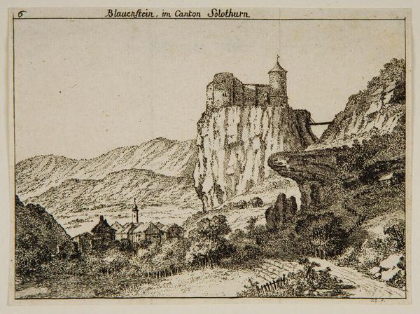 Editor: Here we have Johann Heinrich Meyer's "Rhäzüns," a detailed landscape piece. The stark contrast and precise lines are striking. How do you interpret the composition of this work? Curator: The composition reveals a clear hierarchy. Note how the artist uses linear perspective to guide the eye from the foreground figures, to the elevated village and culminating with the dominant mountain. Consider the strategic placement of the village. Editor: You're right, the village seems almost nestled under the mountain's protection. I hadn’t noticed that before! Curator: Precisely. The artist creates a dialogue between human settlement and natural grandeur. Observe the quality of line. What does that suggest to you? Editor: The crispness of the lines does give it a documentary feel, but also a sense of the sublime. Thank you, I learned a lot! Curator: Indeed, a confluence of observation and aesthetic sensibility. My pleasure.