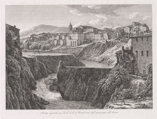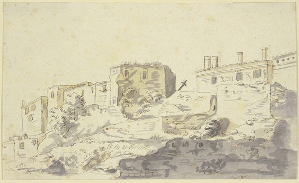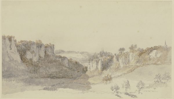 Curator: Here we have Josephus Augustus Knip's "Genzano and Lake Nemi," a watercolor drawing likely completed between 1792 and 1847. Editor: It has such a calm, almost faded quality, like a memory of a place. The textures, particularly in the water, seem incredibly delicate, despite the medium. Curator: It does capture a specific mood. Knip was working in the Romantic tradition, when landscapes served not just as records but as emotional registers. Lake Nemi and Genzano were popular subjects for artists on the Grand Tour seeking picturesque scenery imbued with historical weight. The Roman campagna, and its remnants, resonated deeply. Editor: The layers of the vista speak volumes to me; the building that appears to cling to the rocks and trees – I wonder about their actual source and what it was like to execute them. There are very soft almost hazy pastels there on a piece that appears fairly small – does it have some level of realism? What level of labour are we ascribing in such landscapes in contrast to the final reception of Romanticism? Curator: That's precisely the kind of discourse the image anticipates. Romanticism in part facilitated by emerging urbanity as an experience to be consumed, made available through drawings, prints and paintings. Those built structures signal power; while Nature encroaches as a quiet rebuttal and reclaiming force. These sites weren't pristine wilderness, but carefully cultivated scenes consumed by privileged travelers. Editor: I wonder then what such consumption of places meant at that time, not necessarily just a pretty rendition of nature, but instead as an ideal and commodified form, perhaps like landscape painting became to represent ideas such as expansion. Curator: Exactly. It mirrored and helped shape contemporary desires for the sublime and the beautiful but of course that's shaped by marketability, and a rising middle class that wanted access to that experience. It's fascinating to consider how these images influenced ideas of landscape, shaping both travel and artistic production. Editor: So, looking closer, one could almost chart shifting cultural and material values as embodied in such landscape renditions of specific locations, how interesting is that? Thanks for enlightening us today on its social underpinnings! Curator: Indeed. Every detail contributes to a rich interplay between history, art, and the forces that shaped their making and meaning.