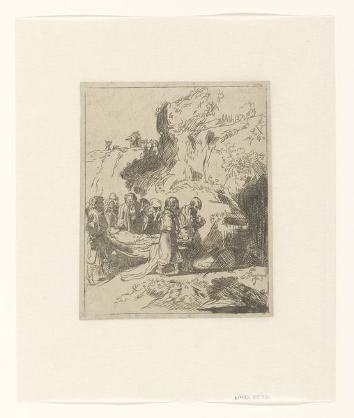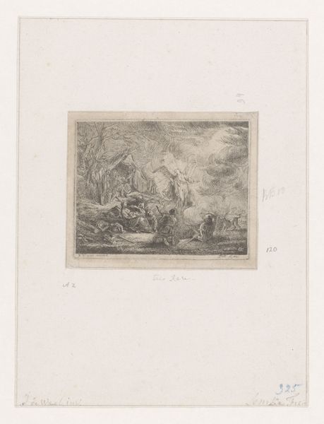 Curator: Let’s consider this etching by Paul Emile Nicolié from 1870, held here at the Rijksmuseum. It is titled "Stilleven van bloemen, vruchten en wild"—Still Life with Flowers, Fruit and Game. Editor: It’s interesting! There's a dreamlike quality. A table laden with an almost overwhelming abundance, softened by the print medium. It certainly lacks the vibrant color we'd expect. Curator: True. I’m struck by what a material rendering reveals about consumption in this era. Etching allows for such fine detail in depicting these items. Reflect on how this portrays abundance and access. The flowers, fruits, and suggestions of 'wild' game—they signal status and privilege. Editor: And, crucially, it forces us to consider the labour embedded in this representation of plenty. We are not explicitly given information, but behind the scene is an implicit depiction of harvest and agriculture, of human intervention shaping natural resources. This is especially significant considering this artwork has elements of both still life and print media in tandem, and could make use of both reproductive methods of agriculture as well as methods of printing to make many. Curator: Absolutely. What stories do the elements tell? The floral arrangements, particularly the ways they’re contained and cultivated. Look closely: These blooms weren't gathered naturally—they are commodities displayed in vases, emblems of trade and wealth, contained as decoration, as if for consumption through only the eyes. The medium here can be a reflection of our very social understanding of beauty as consumable items. Editor: I agree. And there’s something haunting in its lack of colour. It makes the excess and display more obvious; without pigment, it could comment on a sort of class that’s devoid of colour. Curator: In Nicolié’s work, the etching captures more than just aesthetic value. Editor: The image serves as an allegory for how material goods construct not only status but also identity in complex and nuanced ways. Curator: Precisely, a poignant representation for its time, even now. Editor: An incisive commentary for us as we move towards ecological concerns as well. Thanks to its monochromatic and reproducible design, this makes use question a sense of timelessness in a piece about nature and consumption.