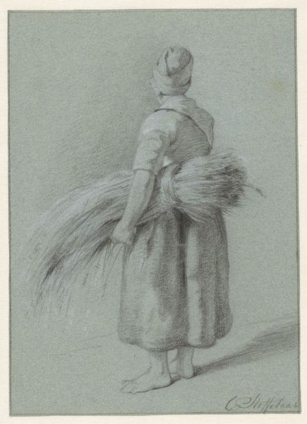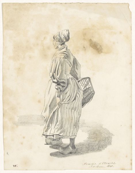 Here we see a pencil drawing by Pieter van Loon, titled 'Standing Woman with Basket, Seen from the Back'. The composition centres on a solitary figure, depicted from behind. Van Loon’s strategic use of line and shadow models her clothing and the basket, creating a gentle interplay of light and form. Notice how the folds of her dress and the texture of the basket are rendered through subtle variations in pencil pressure. This close attention to materiality provides depth and volume within the drawing's limited tonal range. The woman’s posture and the angle of her head suggest movement, implying a narrative that invites speculation about her destination and purpose. The semiotic elements in the artwork, such as the woman's traditional attire, engage with cultural codes reflective of the period. The drawing thus presents a quiet meditation on form, texture, and cultural identity, inviting viewers to find their own meaning within its simple, elegant structure.