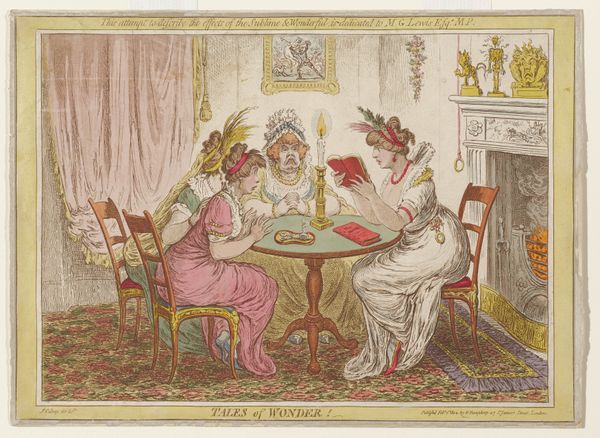 Curator: Here we have George Cruikshank's etching and colored pencil work, "The Cholic," possibly from 1819. Editor: My initial impression is one of intense agony and a touch of the grotesque, but presented in a rather… refined way. It's like a nightmare served on fine china. Curator: A keen observation. Cruikshank, known for his social caricatures, utilizes the print medium to broaden its reach. Consider how the etching, alongside hand-applied color, would allow for a more democratized distribution of this potent imagery. It critiques, through visual means, the social realities concerning health and the body in Romantic era society. Editor: Precisely. Note the devils tormenting the poor woman, and that beam constricting her waist. This vividly depicts physical distress, and I cannot ignore the artistic and cultural memory relating such bodily affliction to symbolic 'devils.' Do you see hints of how anxieties might coalesce in one’s own perception, externalized in these demonic torturers? Curator: Indeed. Also, don’t miss the satire implicit in rendering the material excesses—the plush chaise lounge, her fine gown—in the same frame as this visceral display of suffering. The production of such items necessitates social disparity, perhaps insinuating the source of her "cholic." The labor underpinning the material comfort starkly contrasts with the lady's personal torment. Editor: Symbolically, though, consider her constricted waist. Her suffering could also speak to constraints on women of the period: those of dress, and, more metaphorically, the pressures placed on the feminine form both physically and socially. The ‘devils,’ then, may symbolize anxieties related to restrictive societal norms. Curator: I’m especially drawn to how the materials themselves—etching and color—mediate that tension, enabling Cruikshank to render visible and tangible the societal strains manifesting as individual affliction. Even in our looking, it urges a critique of its means, not just of its symbols. Editor: Very well observed! And to me, the longevity of such symbols points towards cultural undercurrents that linger still. In short, it is always important to contemplate the meaning but, equally so, our connection to it as the viewer. Curator: Absolutely. Thinking about both production and representation deepens our viewing.